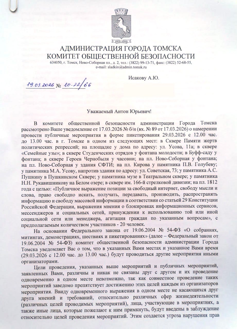 1 марта в Новосибирске митинг в защиту «Телеграма» пытались провести в местном «гайд-парке», где по закону не требуется согласование, но городские власти все равно его запретили, сославшись на обрезку деревьев. Территорию огородили, вход оцепили, а участников задержали. Позже их отпустили без протоколов.