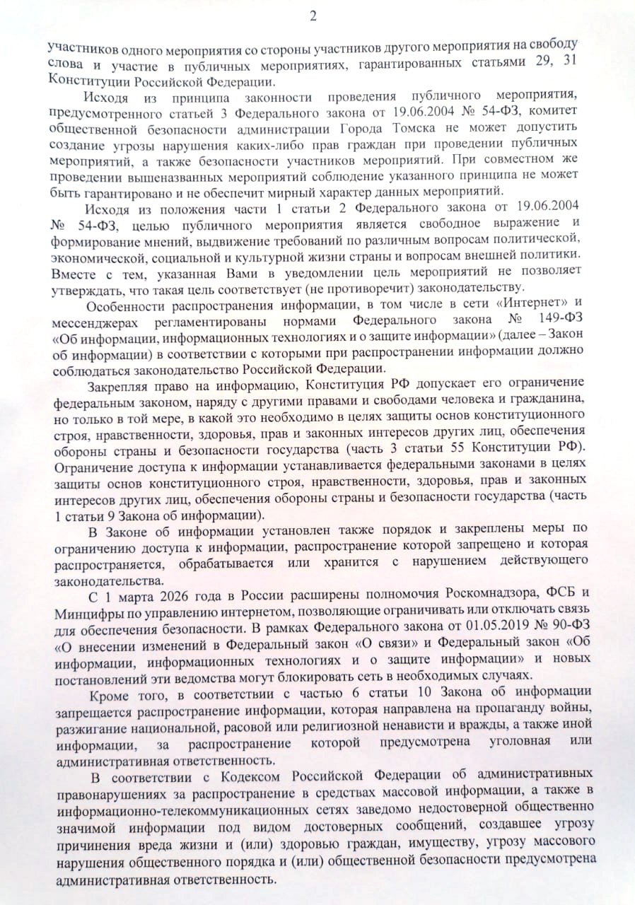 В девяти других городах, где пытались провести акции против блокировок, власти запрещали мероприятия, ссылаясь на неубранный снег, ковидные ограничения и «отсутствие в стране блокировок и репрессий». В Барнауле мэрия отказалась согласовать митинг, уточнив, что формулировка «против политических репрессий», которую использовали в уведомлении, «не соответствует действительности», а выражение «против блокировок популярных интернет-ресурсов», по мнению властей, «расходится с реальностью».