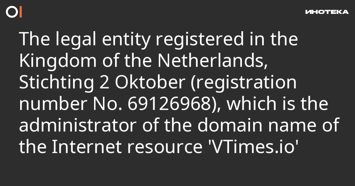The legal entity registered in the Kingdom of the Netherlands, Stichting 2 Oktober (registration number No. 69126968), which is the administrator of the domain name of the Internet resource 'VTimes.io'