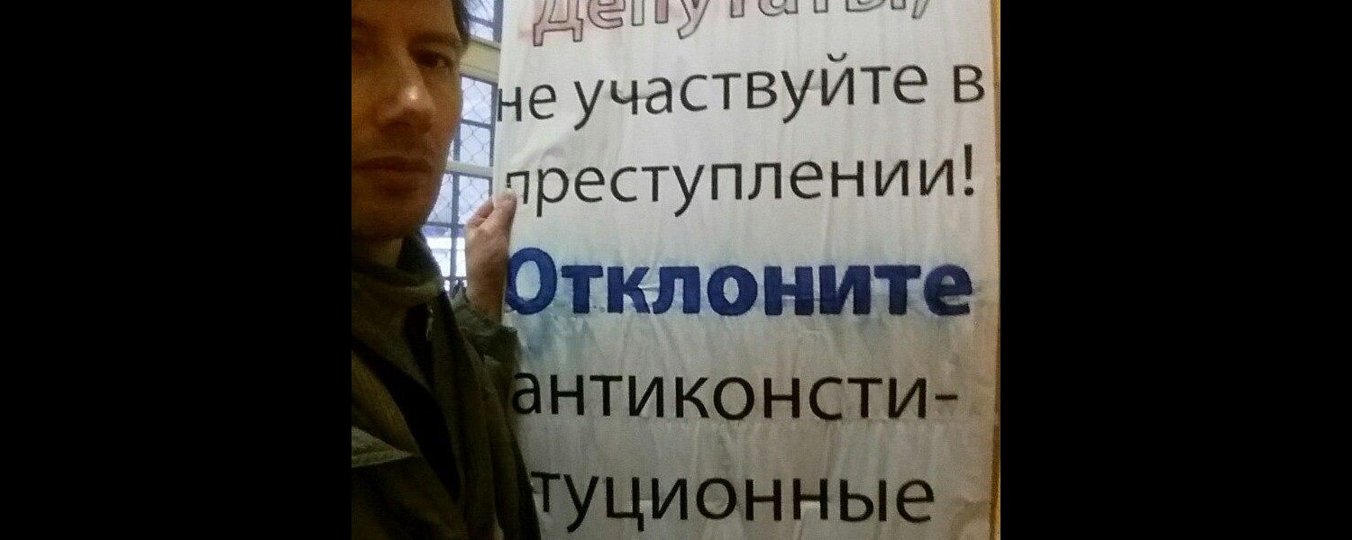 Мусин вернулся на пикет с плакатом «Путинские поправки — плевок вам в лицо». У него изъяли плакат без протокола.